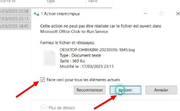- cocher “Faire ceci pour tous les éléments actuels”, et clic sur le bouton “Ignorer”, il se peut qui reste quelque fichier qui sont utiliser