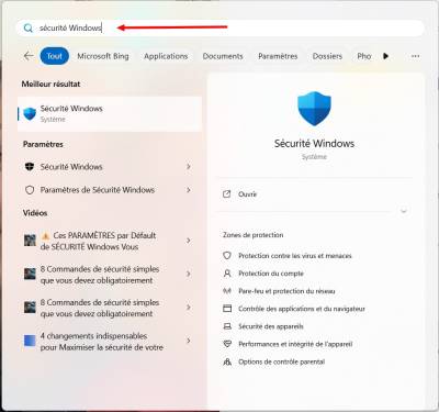 <tab> - Clique sur le menu Démarrer, puis tape “<color #ed1c24>Sécurité Windows</color>” et ouvre l'application.