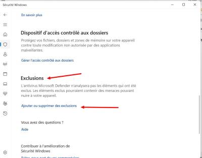 <tab> - Fais défiler jusqu’à Exclusions et clique sur “<color #22b14c>Ajouter ou supprimer des exclusions</color>”.