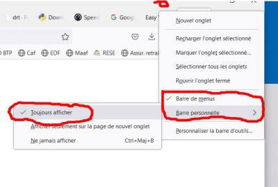 - Une autre astuce, clic droit en haut comme indiquer en rouge sur image, un sous-menu s'affiche clic gauche “Barre de menus”, puis sur “Barre personnelle” ouvre un autre sous-menu clic sur “Toujours afficher”.