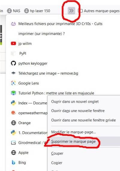 - Pour supprimer un marque-page clic gauche le double chevrons, chercher le nom de la page-lien, que vous voulez supprimer, clic droit dessus le nom, une fenêtre s'ouvre et clic gauche “Supprimer le marque page”. Et c'est finis.