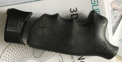 - La crosse d’un pistolet a fait l’objet d’un rallongement spécifique. Cette modification a été réalisée afin d’améliorer la prise en main de l’arme. Le travail a consisté à ajouter une extension parfaitement adaptée. Un soin particulier a été apporté pour conserver l’équilibre et l’esthétique. Une photo a été prise pour illustrer le résultat final de cette transformation.