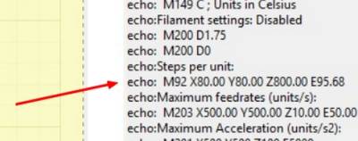 - écho: M92 X80.00 Y80.00 Z400.00 E150.00 il se peut que les valeurs soient différentes selon votre modèle d'imprimante, mais à la base ses aux débuts la première ligne qui parle de M92 la valeur qui nous intéresse est E150.00 ensuite, sur l'image (E = 95.68 pour moi, après correction).