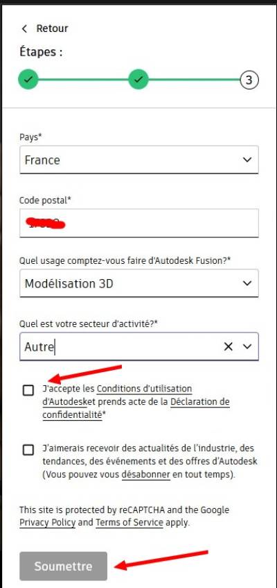 - Remplir, “Accepter les conditions d'utilisation” et “Soumettre”, étape 3.
